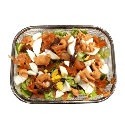 La Ensalada de ahumados es una experiencia marina con carácter: hojas de lechuga fresca abrazan finas láminas de salmón y sabrosas anchoas, acompañadas de huevo duro en su punto y coronadas con una cremosa salsa rosa que potencia cada matiz. Ideal para quienes buscan una ensalada con alma y sabor intenso, sin renunciar a la ligereza.
